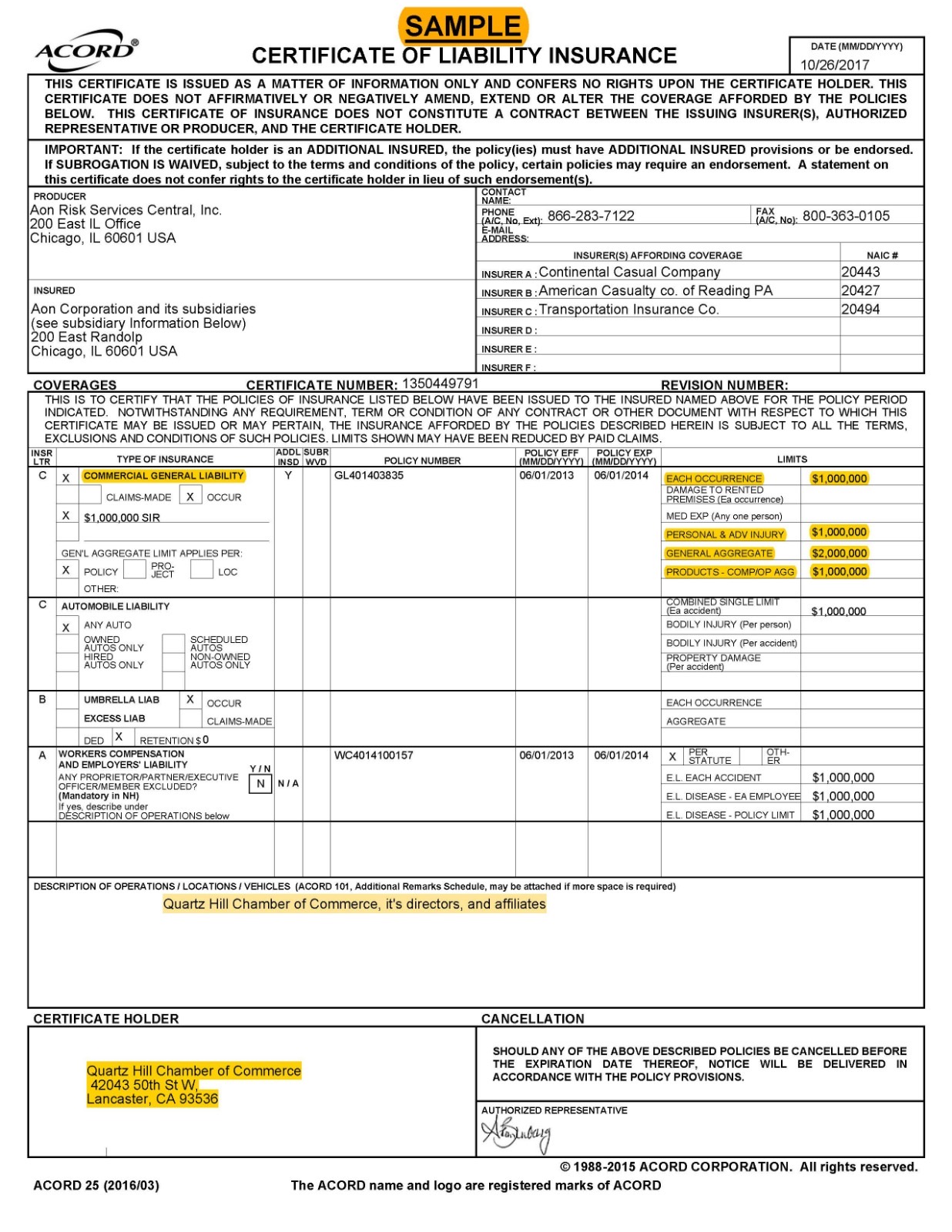 - A CERTIFICATE OF INSURANCE FOR QUARTZ HILL CHAMBER WITH ADDITIONAL INSURED ENDORSEMENT: